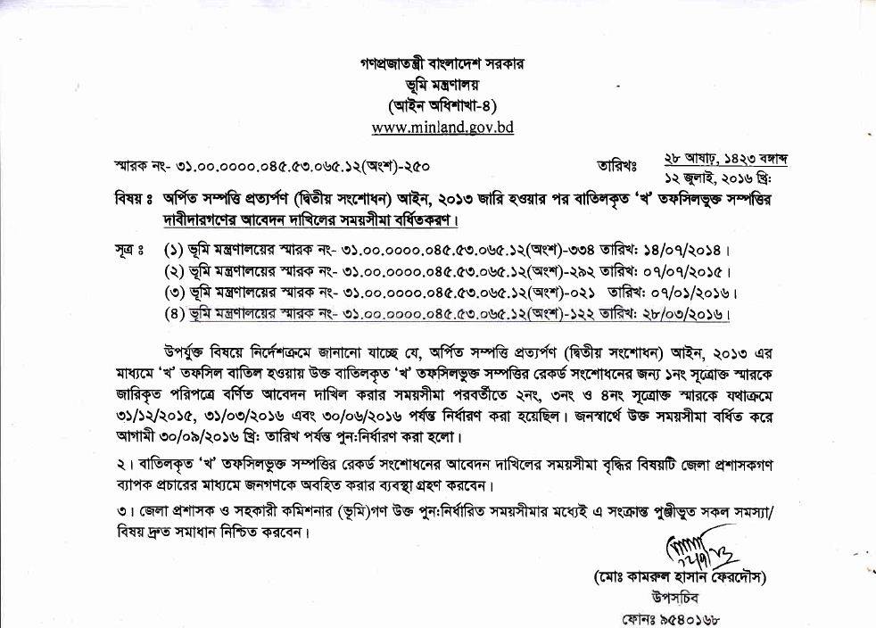 বাতিলকৃত "খ" তফসিলভুক্ত অর্পিত সম্পত্তির আবেদনের সময়